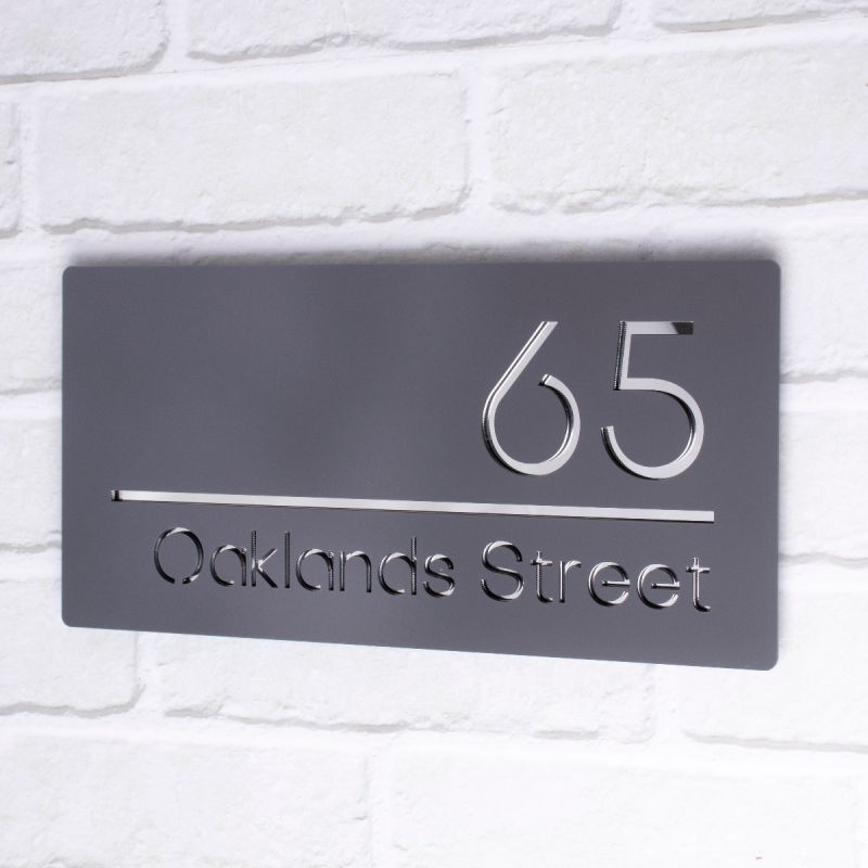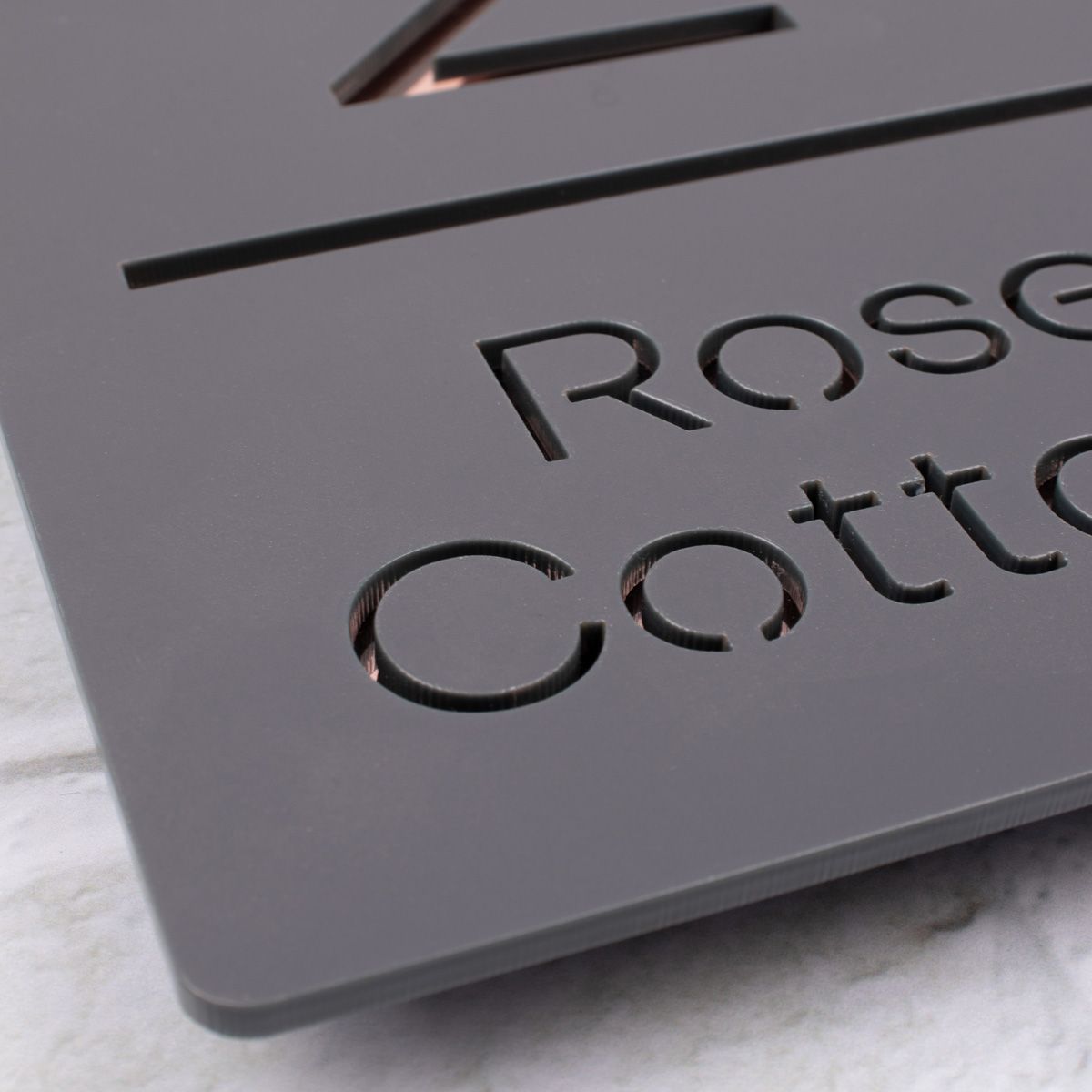 This contemporary modern house sign is made from two sheets of laser cut 3mm acrylic. The front panel is available in 4 matt acrylic colours & the back colour which will also be the text colour, is available in a choice of 3 stunning mirror acrylic finishes, rose gold, silver, or gold. The contemporary house sign has hidden standoff fixings on the rear which allow the design to appear to float off the wall.