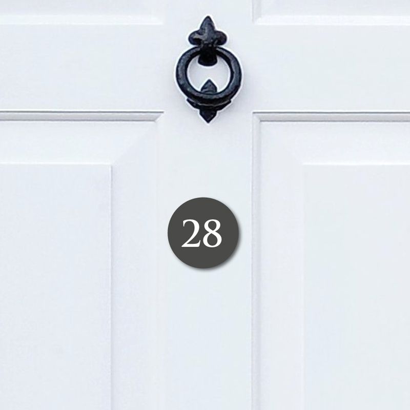 This round acrylic door number will add a unique touch to you front door. The circle is laser cut from from 3mm thick acrylic. The door number is self adhesive which makes it so easy it apply, just peel off the film and stick to any smooth flat surface. The text is printed onto the round arcylic door number using specialist UV inks, which bonds to the material giving it a vibrant and tough finish. Guaranteed, weather resistant, will not fade or deteriorate.