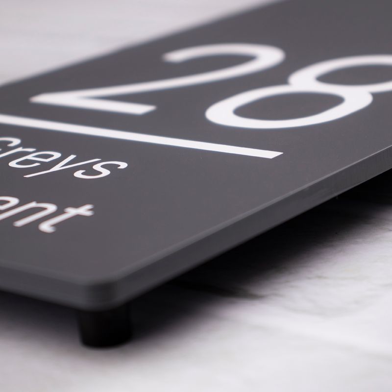 Contemporary house sign modern door number acrylic plaque – Tivoli. To add text to your personalised sign, simple click on the ‘Personalise‘ below above & start designing. Please email or call us if you have any special instruction or queries about your order.